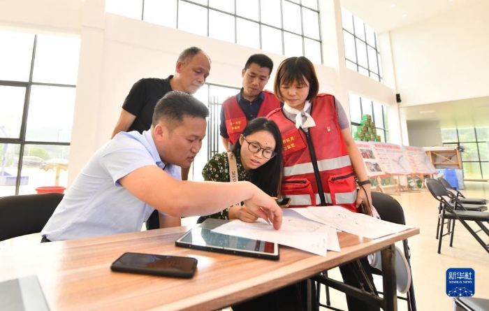 2022年5月6日,廣西柳州市融安縣大坡鄉(xiāng)崗偉村駐村第一書(shū)記黃晨暉(后排右)和鄉(xiāng)鎮(zhèn)干部、工程設(shè)計(jì)人員在大坡飛雞農(nóng)特產(chǎn)品大數(shù)據(jù)中心討論崗偉村產(chǎn)業(yè)示范帶方案。新華社記者 黃孝邦 攝