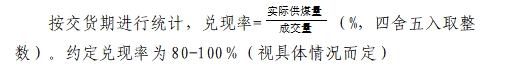 (一)銷方因自身原因導致兌現率低于80%,除按質量考核條款考核外,還將進行兌現率考核,考核金額=成交量×(80%-兌現率)×成交價×5%,從保證金中扣除。